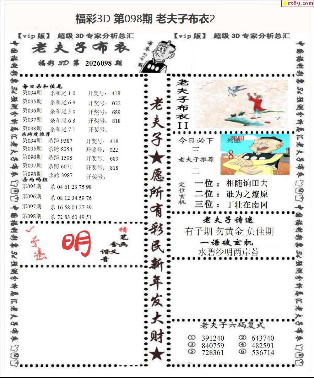 老夫子布衣2026098期3d图谜